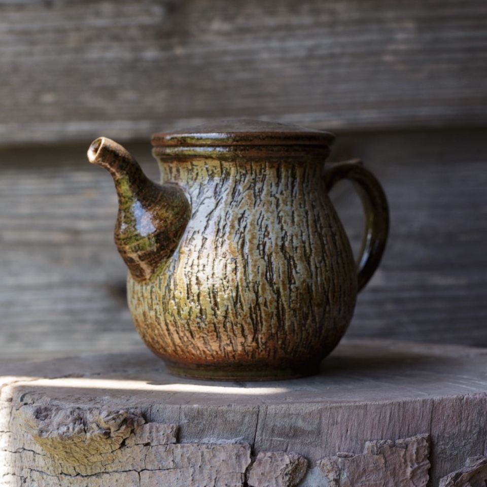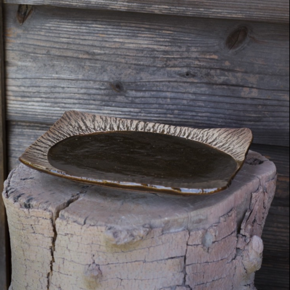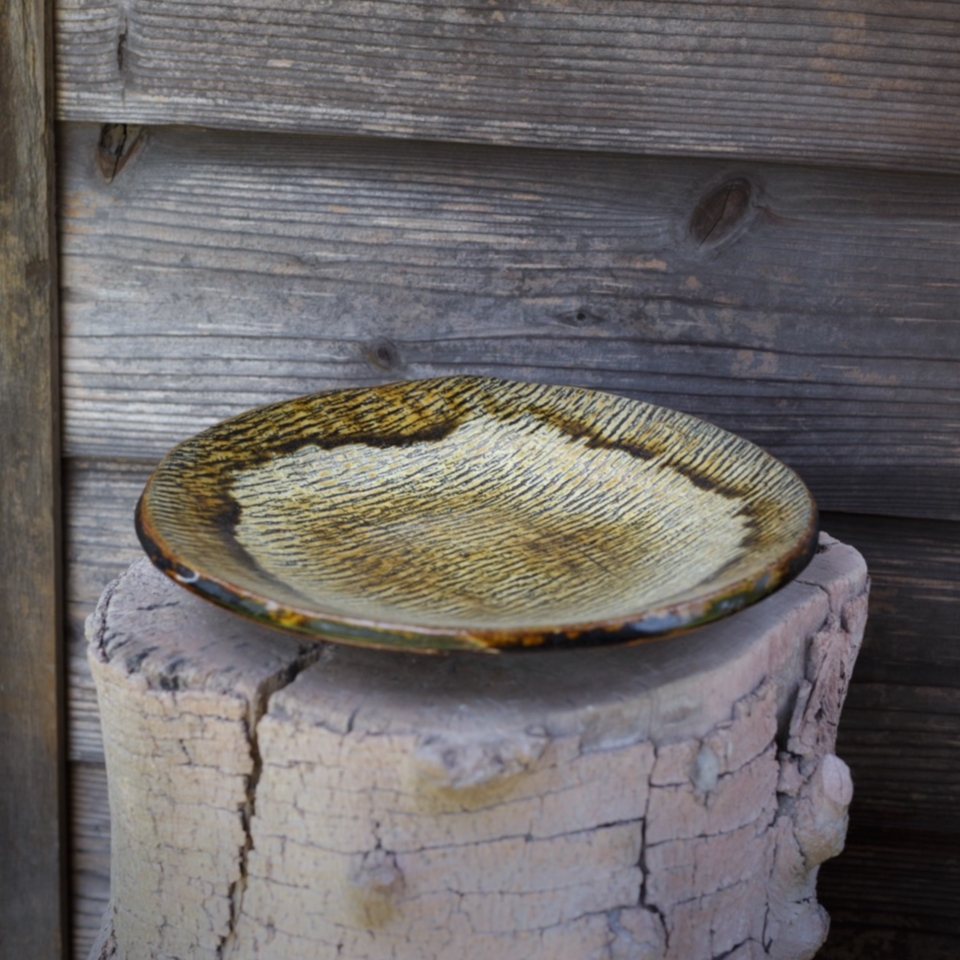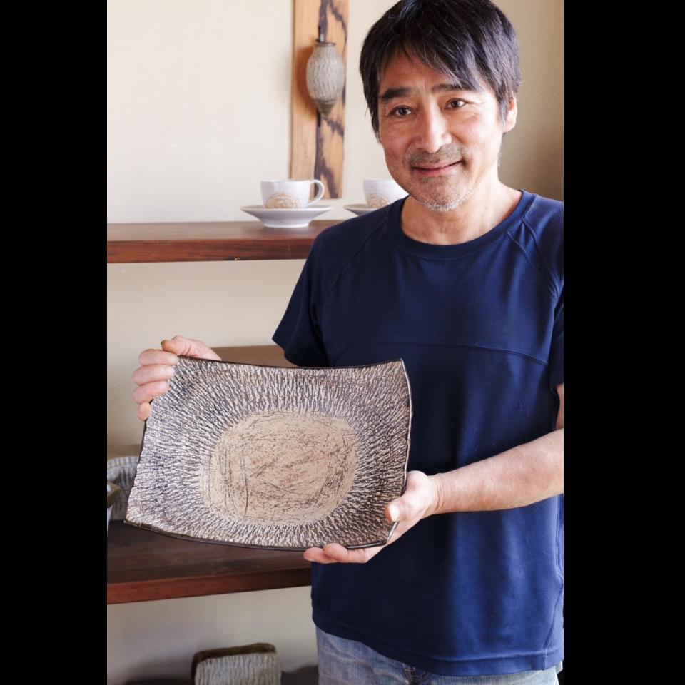 - 私たちの陶房とギャラリーは三浦半島の先端にある「小網代の森」に隣接しています。源流から海にそそぐ干潟まで、森と川と海の生態系が自然のまま残る貴重な森です。幼い頃から土いじりが好きで、高校生の夏に岡山県倉敷市にある酒津焼の窯元に一ヶ月通い詰めました。それが私の初めての陶芸体験です。アートというよりも自然に触れ合う中で陶芸の道に進み、樹皮文は自然と手が動いて出来た文様です。日本文化には季節があり、料理のうつわも季節の楽しみがあります。うつわにも流行があり、時代によって変わっていく面白さがある一方で、みんな同じになっている気がします。陶器のうつわや目でも味わうことの大事さ、こういう伝えられなくなっているものを忘れてはならないと思います。